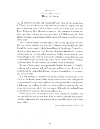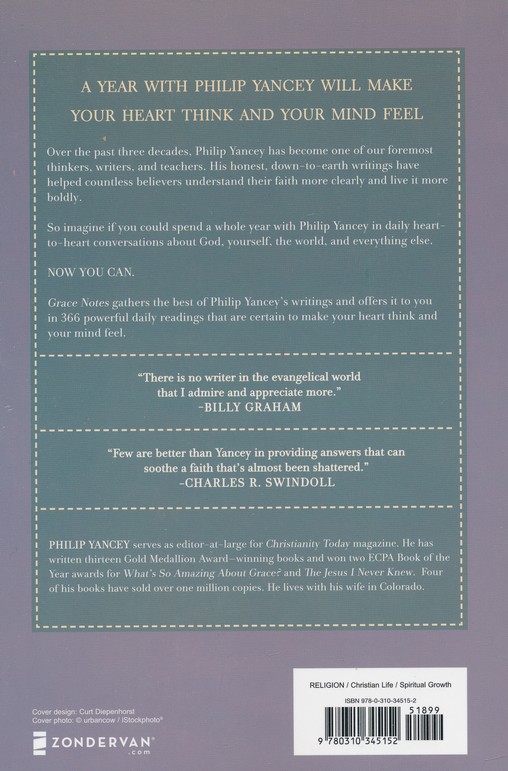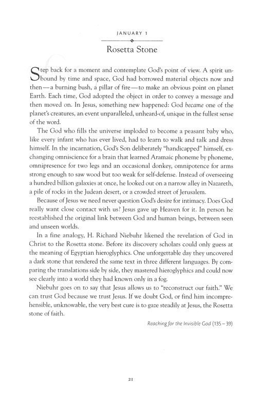 Readings gleaned from one of the best-loved evangelical writers of our day. Yancey is editor-at-large for Christianity Today and has written 13 Gold Medallion Award-winning titles. Widely read, probing in his thinking, and polished in his style, Yancey wants readers to see Christ afresh each and every day. 432 pages, softcover. Zondervan.